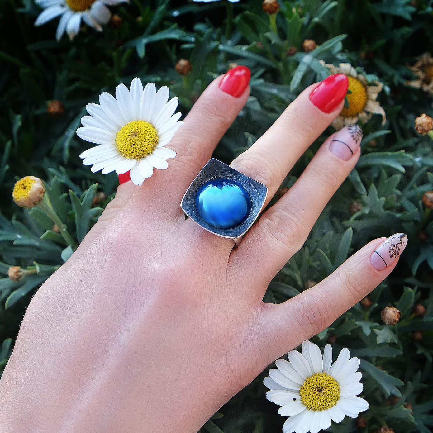 Duży i efektowny pierścionek wykonany z oksydowanego srebra próby 925. Stanowi niezwykłe połączenie surowego metalu szlachetnego i okrągłego oczka z barwionego tytanu. Idealny dla kobiet lubiących nowoczesny design. Może stanowić piękny komplet z kolczykami lub wisiorkiem.