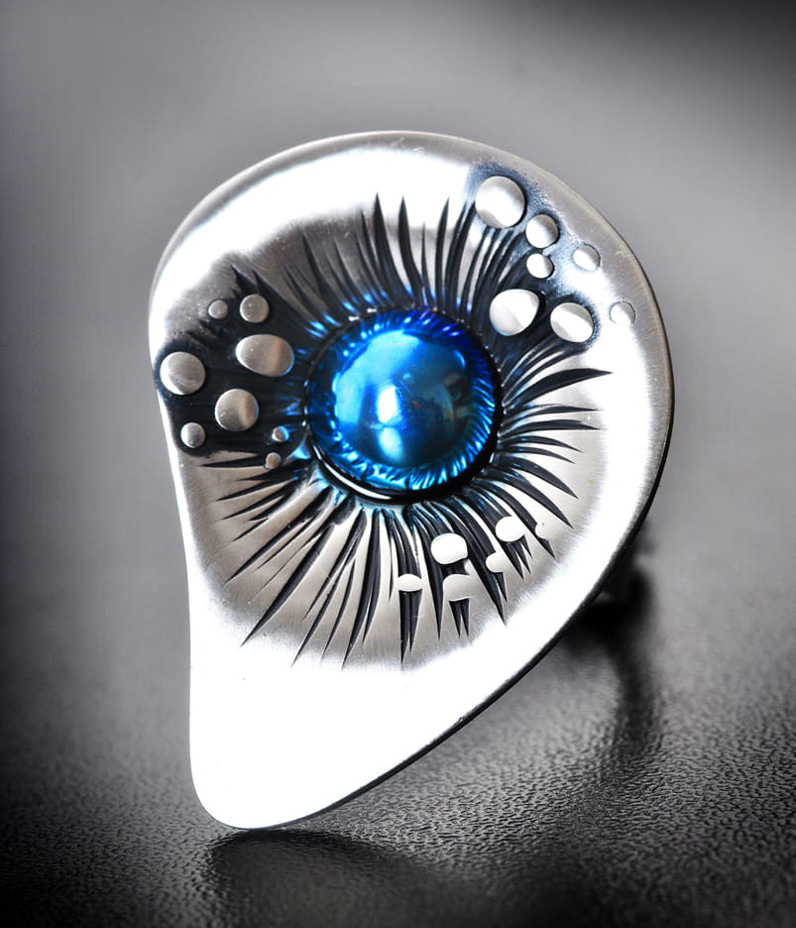 Duży i efektowny pierścionek wykonany z oksydowanego srebra próby 925. Stanowi niezwykłe połączenie polerowanego metalu szlachetnego i okrągłego oczka z barwionego tytanu. Idealny dla kobiet lubiących nowoczesny design. Może stanowić piękny komplet z kolczykami lub wisiorkiem.