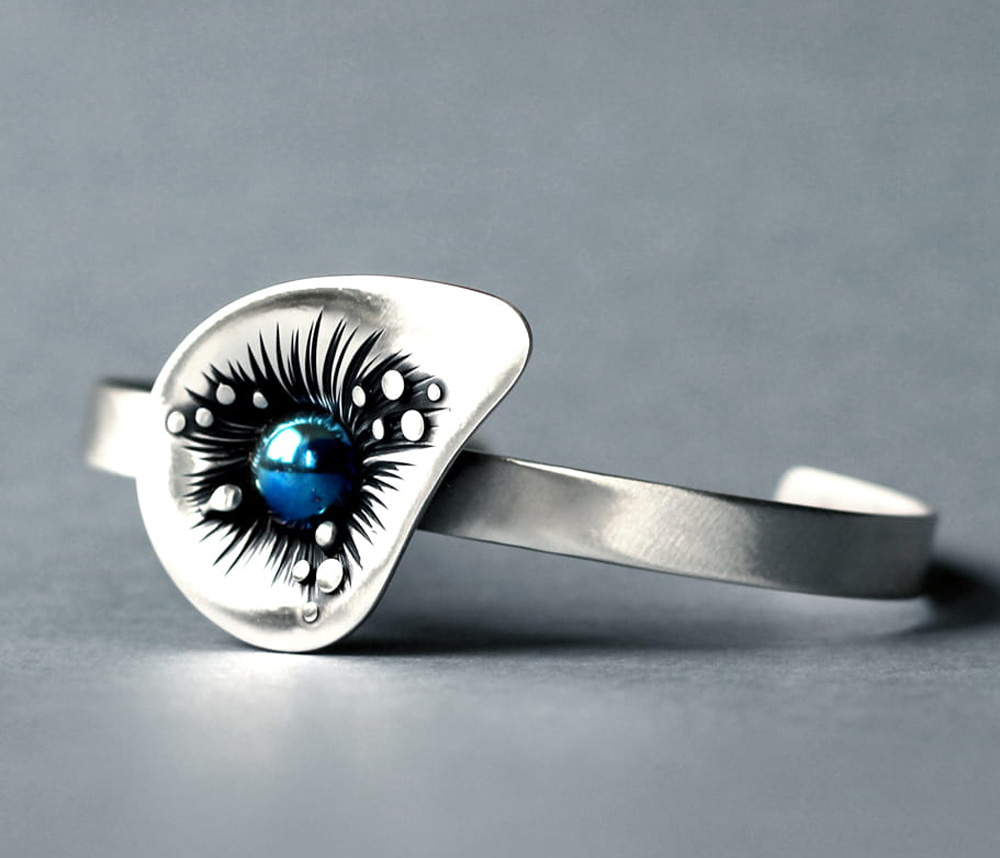 Niezwykła, baśniowa bransoletka wykonana z oksydowanego, satynowanego, błyszczącego srebra próby 925. Niebieskie oczko pośrodku kwiatka wykonane zostało z anodyzowanego tytanu. Bransoletka posiada opcję regulacji. Podczas zamówienia prosimy jednak o podanie obwodu nadgarstka w celu optymalizacji jej rozmiaru. Bransoletka pięknie komponuje się w zestawie z kolczykami oraz zawieszką ROSA.