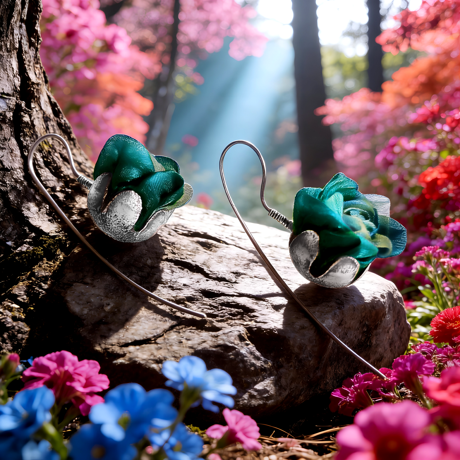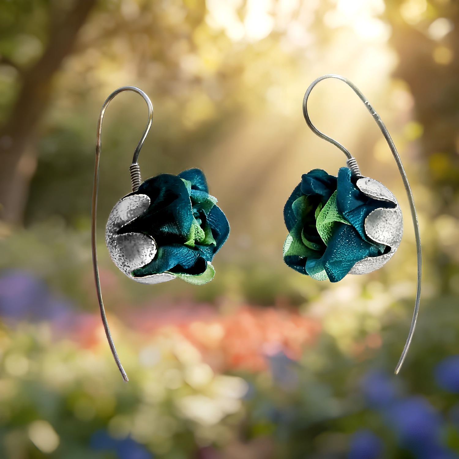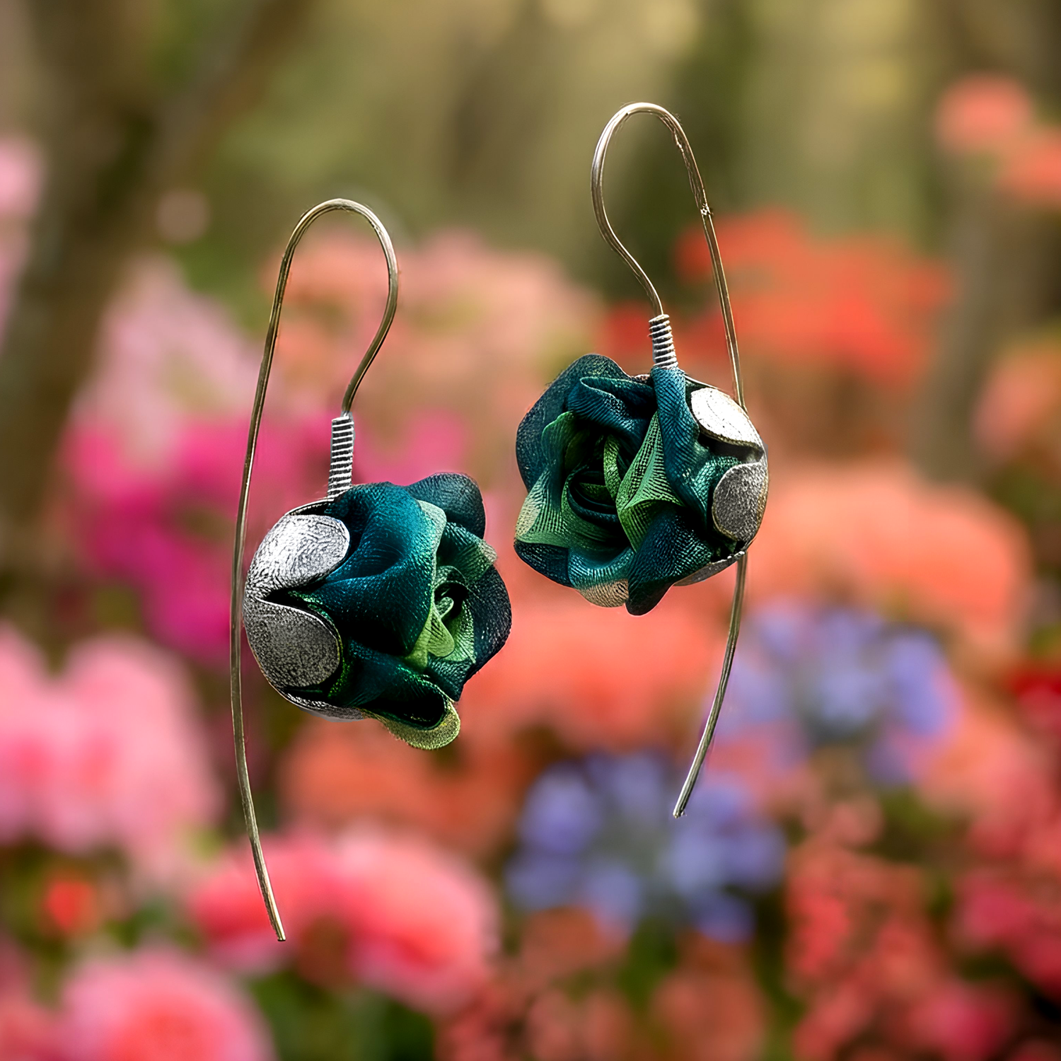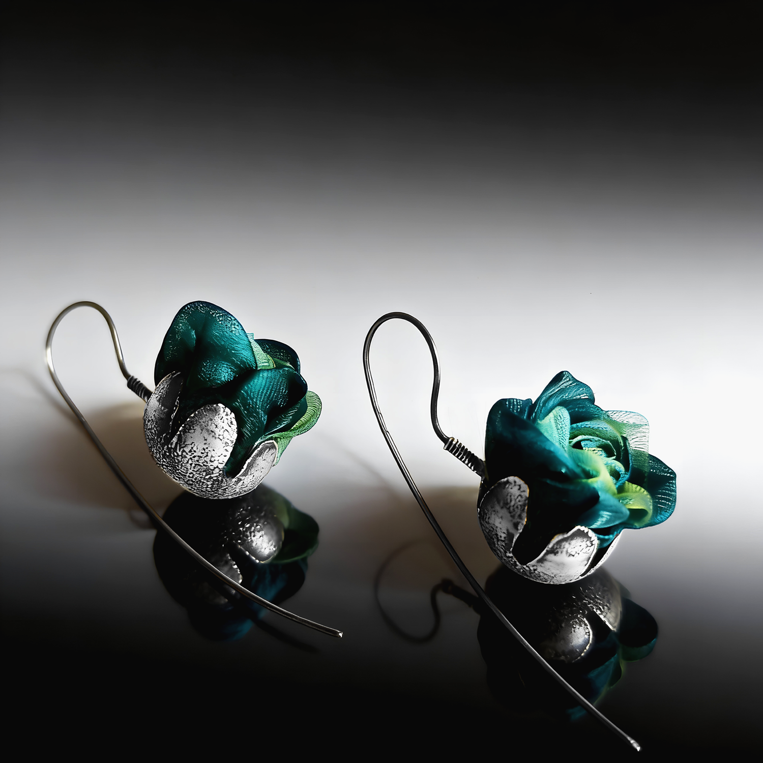 Artystyczne kolczyki różyczki z kwiatkami z pięknej tkaniny w kolorze szmaragdowym. Zostały wykonane z oksydowanego, teksturowanego srebra próby 925. Kobiece, romantyczne i eleganckie, bardzo uniwersalne.