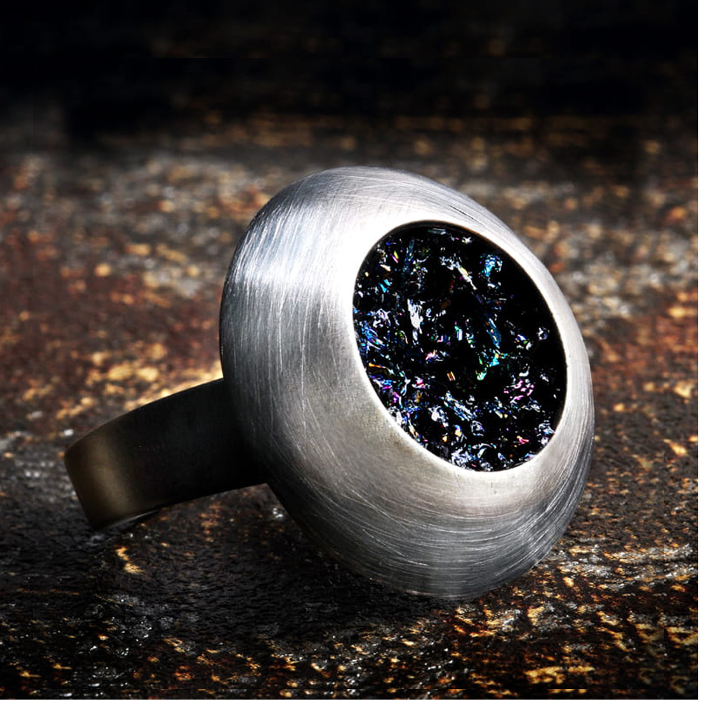 Elegancki pierścionek w ponadczasowej formie. Wykonany z surowego, oksydowanego srebra próby 925. Wewnątrz znajdują się druzy karborundu, czarnego minerału mieniącego się fantastyczną feerią barw.