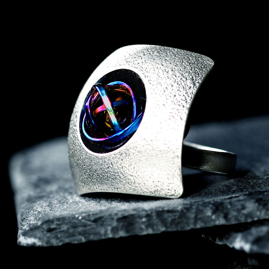 Duży, nowoczesny pierścionek w industrialnym stylu wykonany z oksydowanego, teksturowanego srebra próby 925 i anodyzowanego tytanu. Stanowi niezwykłe połączenie surowego metalu szlachetnego i futurystycznej formy przestrzennej. Idealny dla kobiet lubiących nowoczesny design z nutką fantazji.